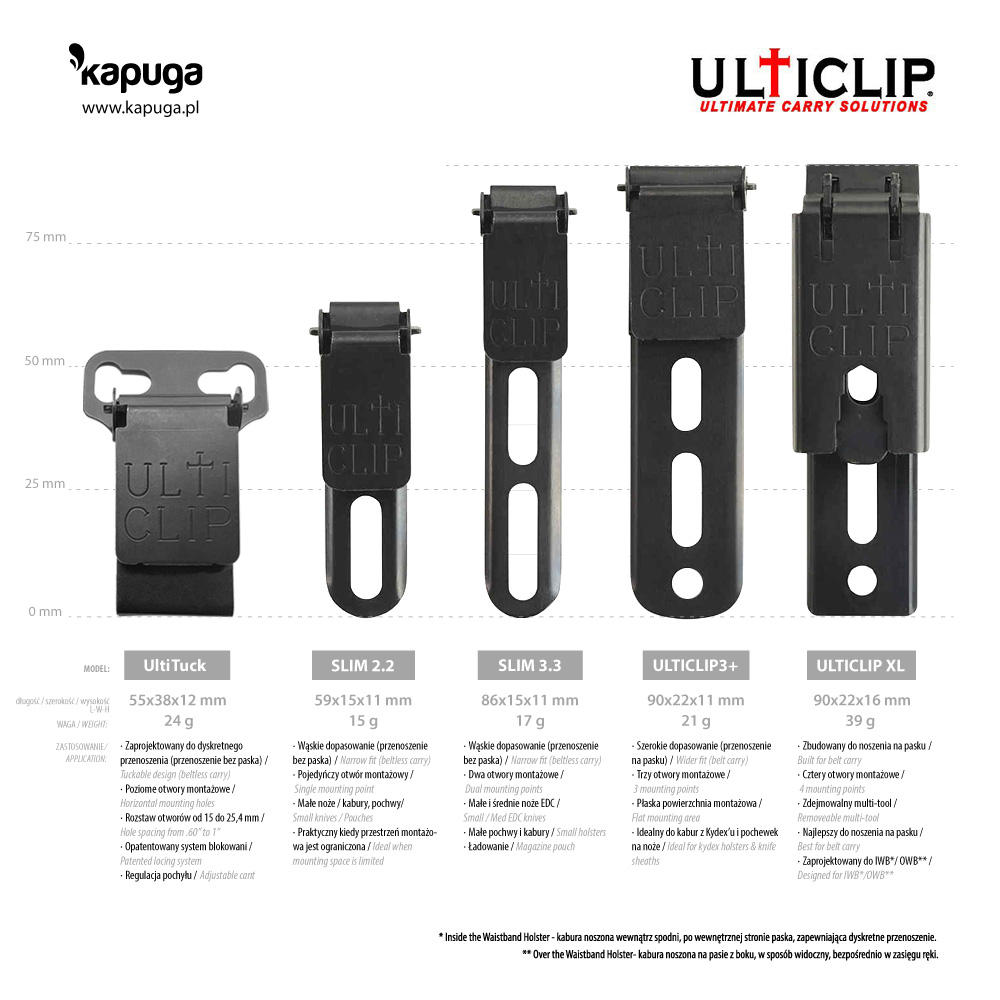 Marka Ulticlip to Amerykański producent wysokiej jakości systemów montażu kabur, pochew nożowych i sprzętu EDC. Ulticlip to klipsy do montażu na pasku lub w kieszeni albo na innych elementach garderoby czy wyposażenia. Wygodne, dyskretne, eleganckie i bardzo wytrzymałe.