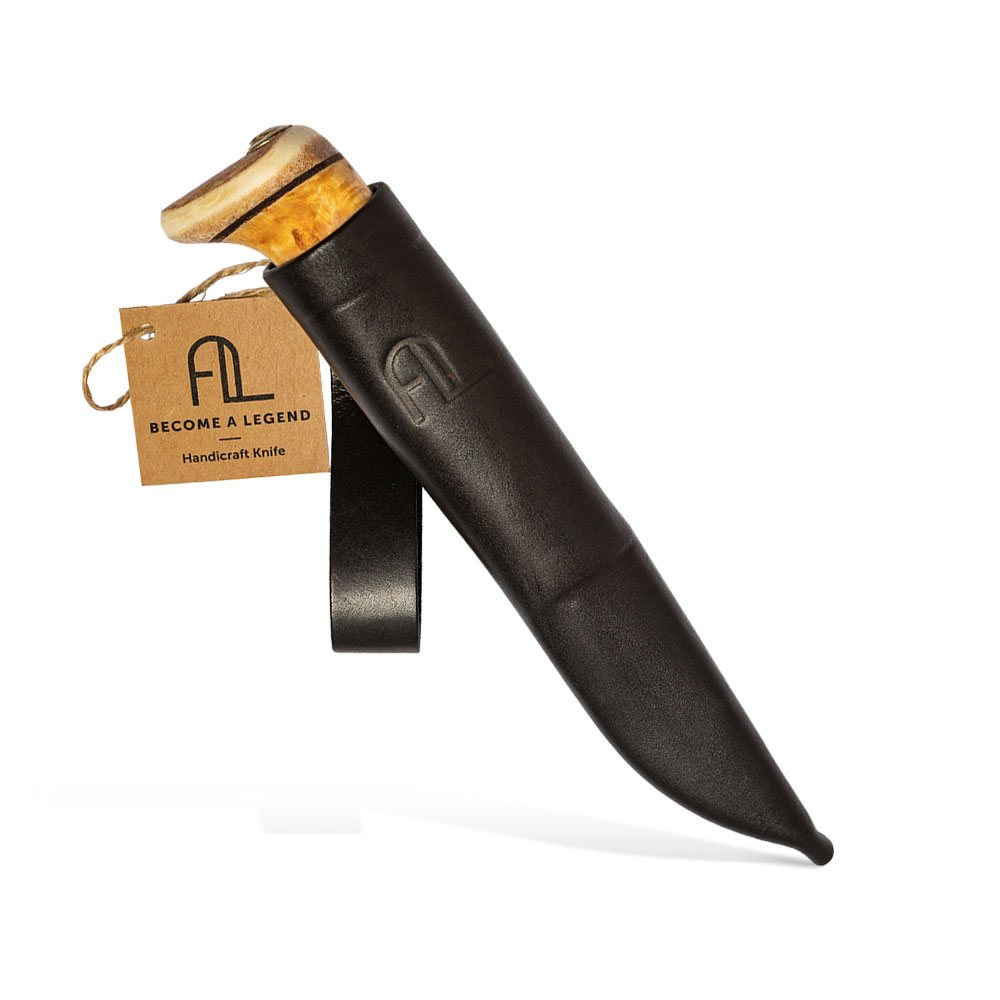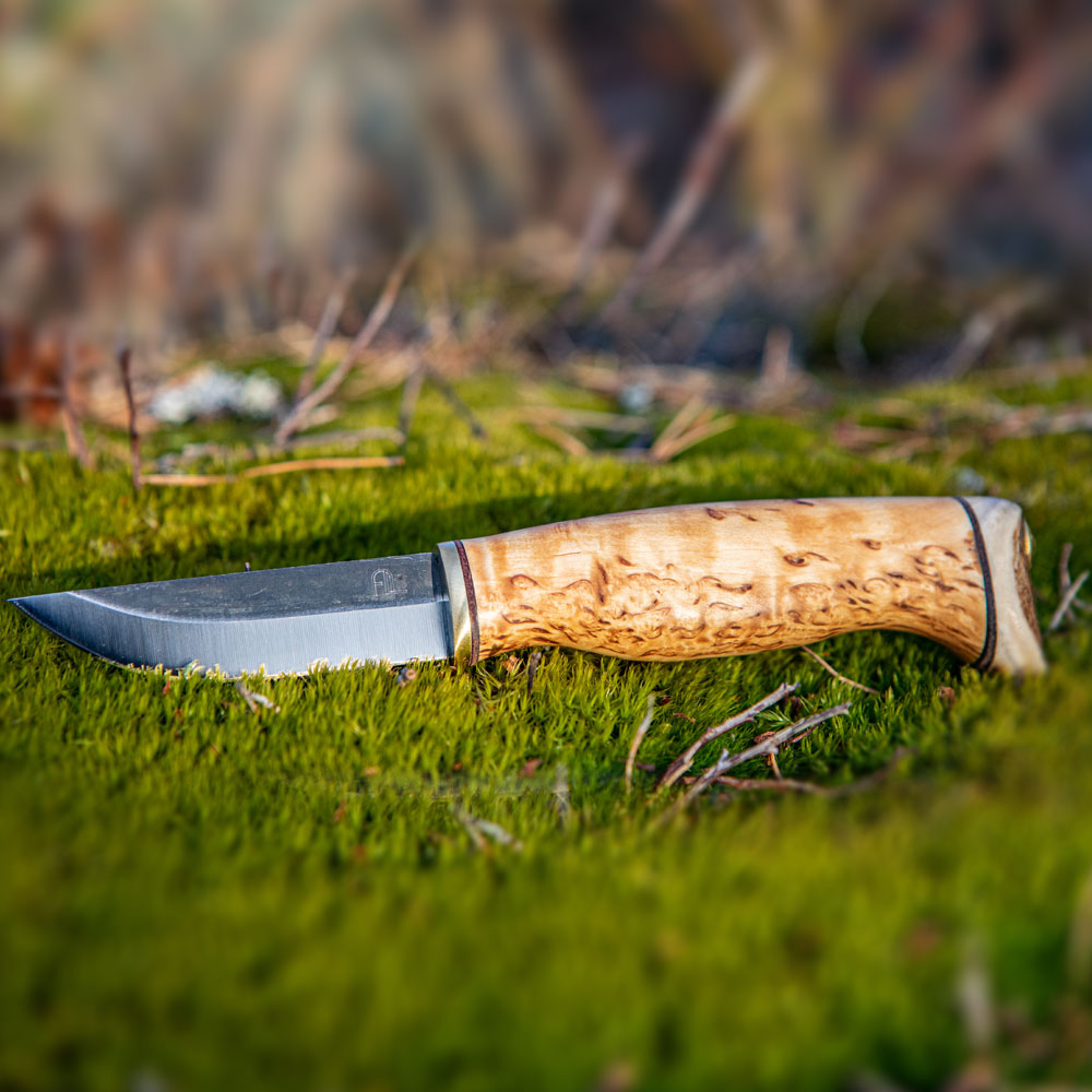 Rękojeść powstała z regionalnego drewna brzozy karelskiej o bardzo charakterystycznym układzie słojów. Drewno to od lat z powodzeniem stosowane jest jako materiał rękojeści klasycznych noży skandynawskich. Samo jej zakończenie natomiast, wykonane jest z poroża co nadaje jej jeszcze większej indywidualności. Profil rękojeści jest bardzo ergonomiczny i przemyślany, zapewniając właściwy i bardzo wygodny chwyt.