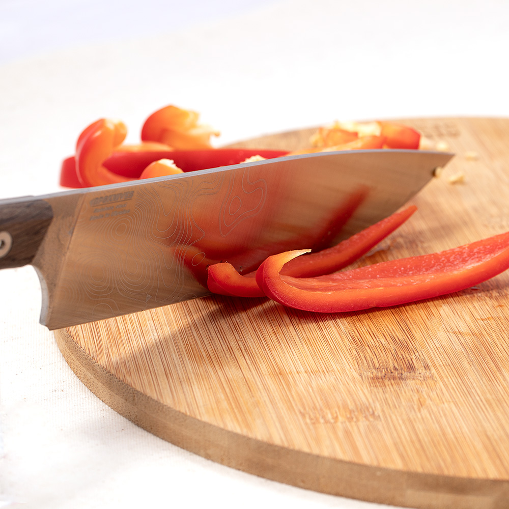 **STAL NIERDZEWNA SKUTECZNA W KUCHNI**: Głownia wykonana ze stali nierdzewnej 5Cr14MoV, wykończona satyną na płazach i ozdobiona fantazyjnym wzorem laserowym. Stal 5Cr14MoV jest stalą nierdzewną świetnie sprawdzającą się w wilgotnym środowisku i charakteryzuje się sporą sprężystością. Jest też bardzo łatwa do ostrzenia.