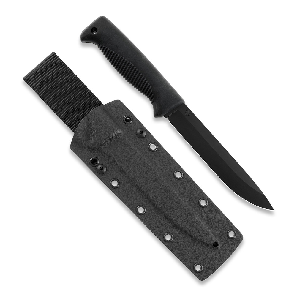 Nóż Peltonen Knives M95 Ranger Puukko Sissipuukko FJP007 Stal 80CrV2 w Czarnej Powłoce Teflonowej PTFE Czarna Rękojeść TPE Czarna Pochwa Kydex