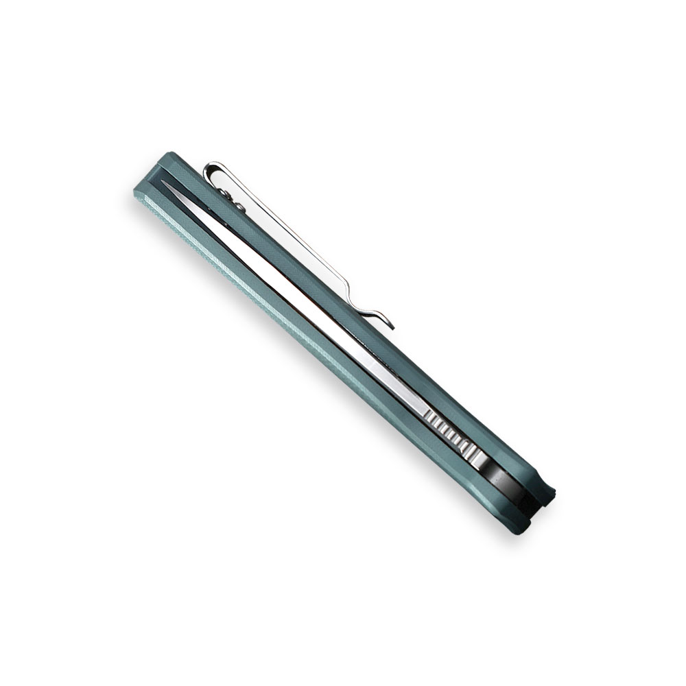 Stalowy klips ze stali nierdzewnej zapewnia stabilne przenoszenie noża w kieszeni, zamocowanie w plecaku, sakwie, nerce itd., czym przyczynia się do minimalizacji ryzyka zgubienia narzędzia. Klips zaprojektowany w stylu pasującym do całości projektu ozdobiony został podpisem designer’a.  W rękojeści zaprojektowano otwór na paracord, linkę itp. rozwiązania zapobiegające przed zgubieniem lub upuszczeniem zabezpieczonego nimi narzędzia. Do otworu można również doczepić ozdobny koralik itd. (koralik nie znajduje się w zestawie).