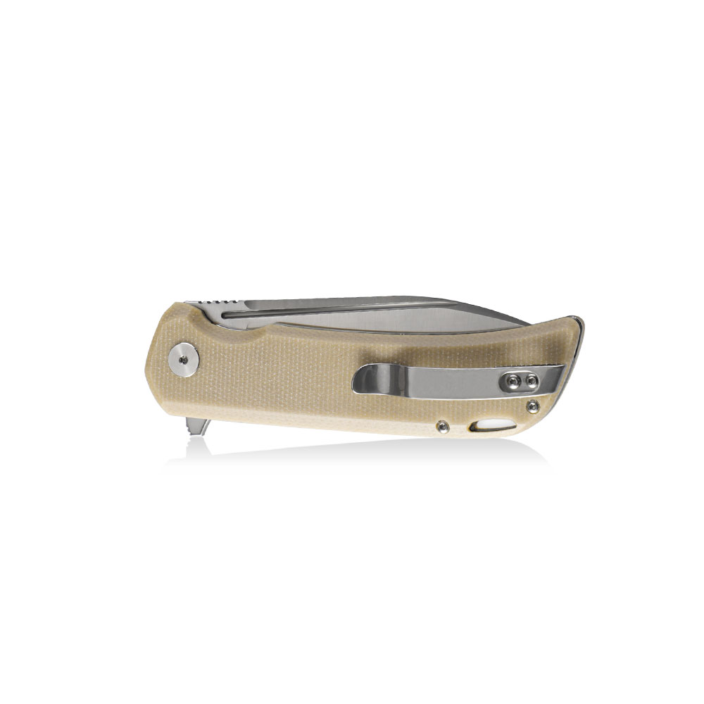 Prezentowana wersja noża to ostrze w klasycznej satynie oraz okładki rękojeści z brązowej micarty o jasnym, zbliżonym do beżowego odcieniu.