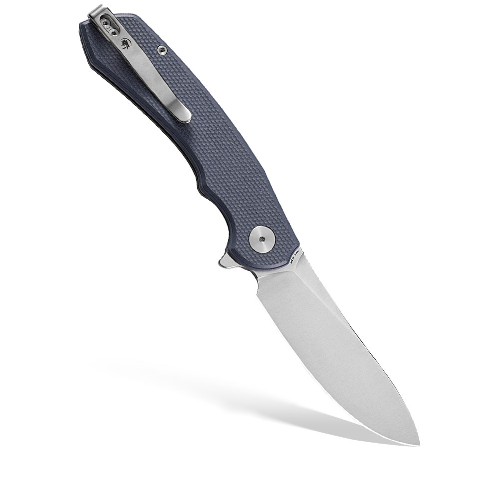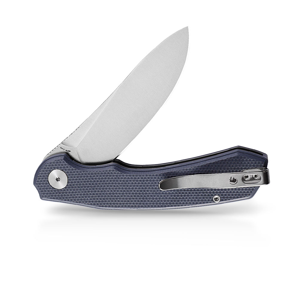 - Rękojeść: Stonowany niebieski kompozyt G10, stalowe linersy, klips stalowy (Tip-Up, Deep Carry, przekładalny na drugą stronę)