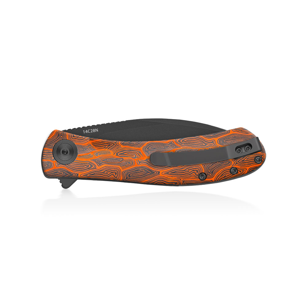 - Rękojeść: Okładki z multikolorowego G10 o wzorze skorupy żółwia (Orange Turtle G10), stalowe linersy i backspacer, stalowy klips typu Deep Carry / Tip-Up