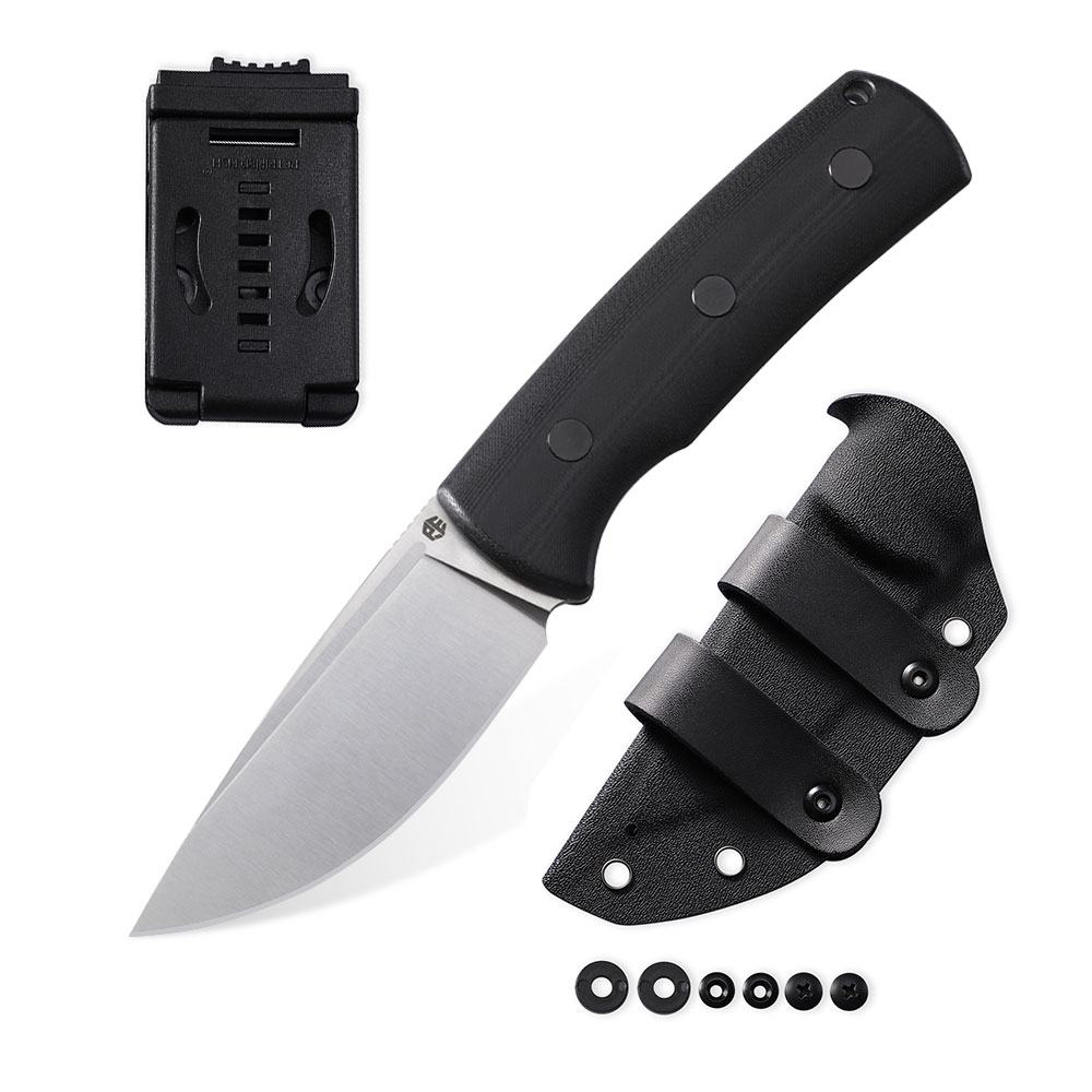 - Pokrowiec: czarna pochwa Kydex z dodatkową klamrą typu Tek-Lok