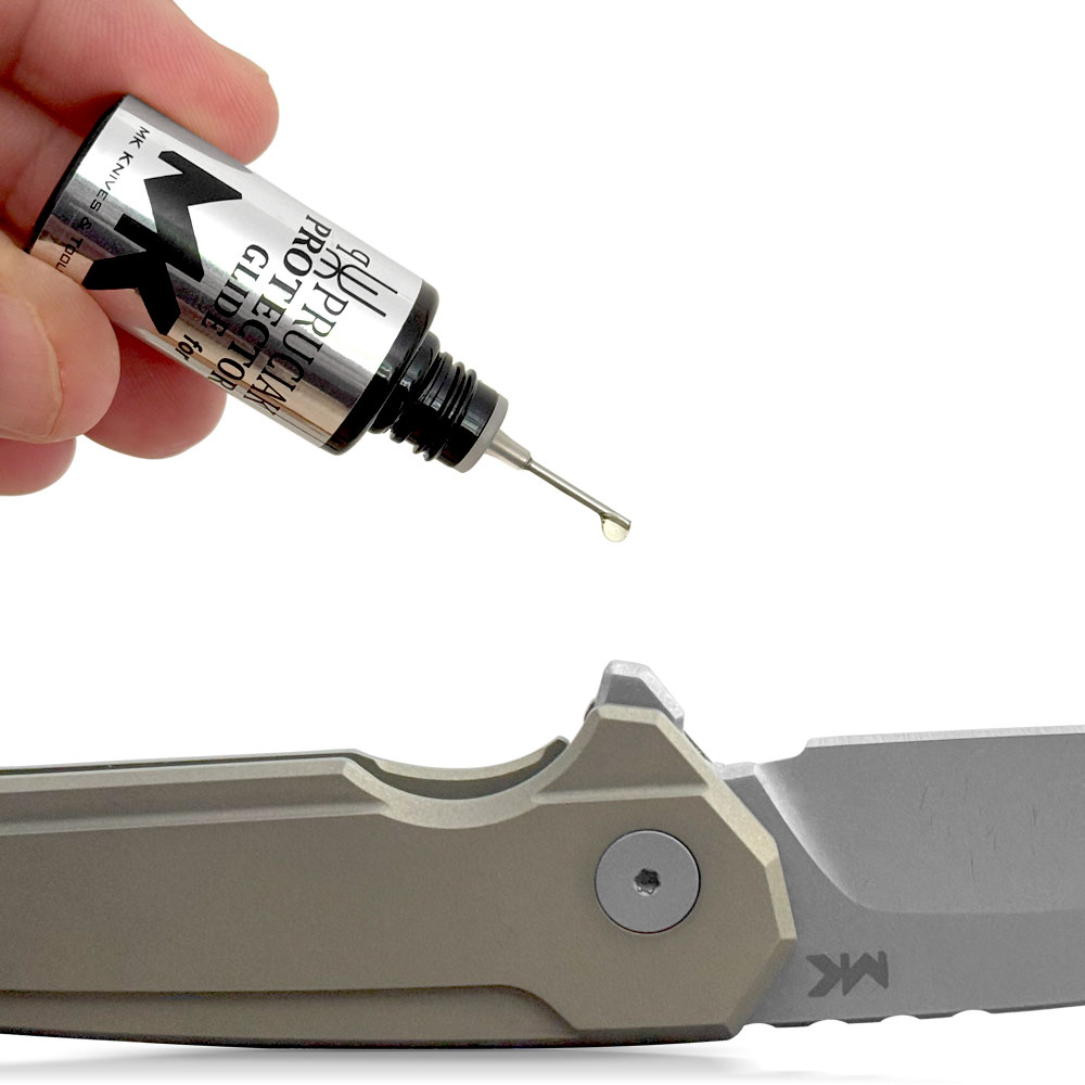 Olejek MK Knives & Tools Glide by Pruciak Protector Do Smarowania i Konserwacji Noży Składanych Multitooli Sprzętu EDC. Wersja na potrzeby serwisowania noży i sprzętu codzienego wykonanych przez MK Knives & Tools, uniwersalna również dla sprzętów innych marek.