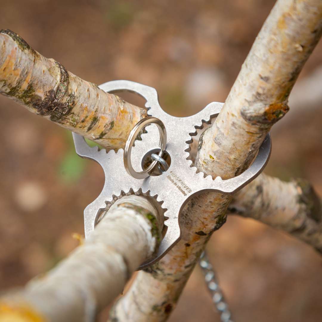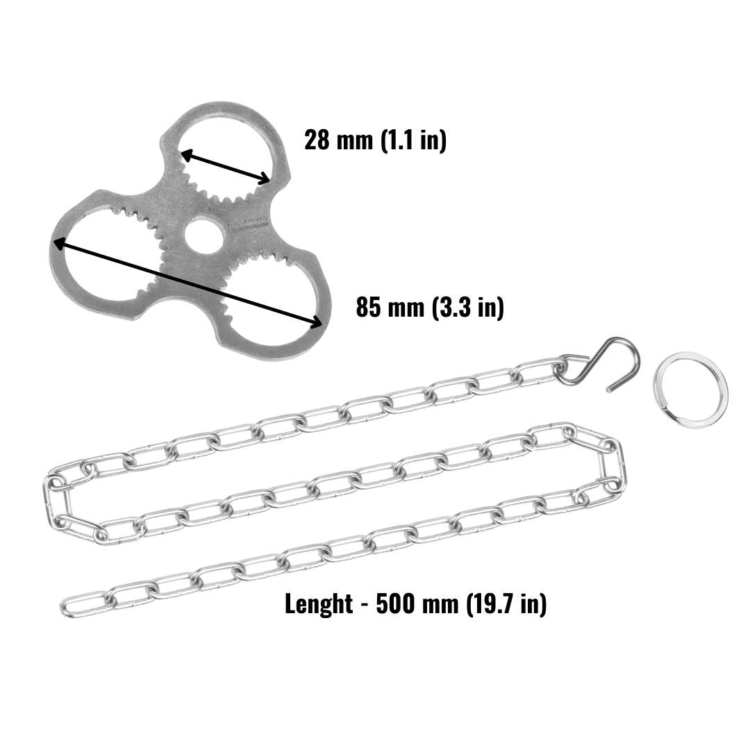 2. REGULOWANY ŁAŃCUCH Z HAKIEM: Wykonany ze stali nierdzewnej łańcuch o długości 500 mm (19.7″) z regulacyjnym pierścieniem umożliwiającym ustawienie pożądanej wysokości gotowania. Hak na końcu łańcucha pozwala na sprawne powieszenie czajnika lub garnka nad ogniskiem.